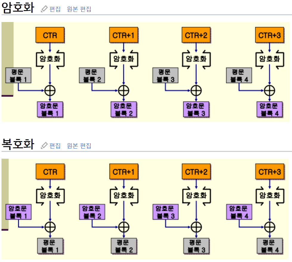 CTR의 경우 데이터 블럭에 따라 IV를 만들고 암호화 키와 평문을 XOR를 통해 암호문을 만드는 것이다.