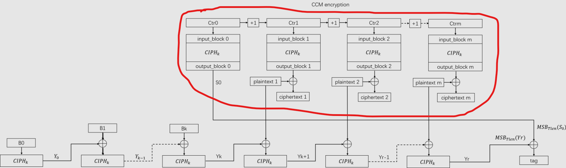 아래는 CCM 모드의 Flow chart이다. 표시된 부분은 앞서 설명한 CTR과 동일한 부분이고