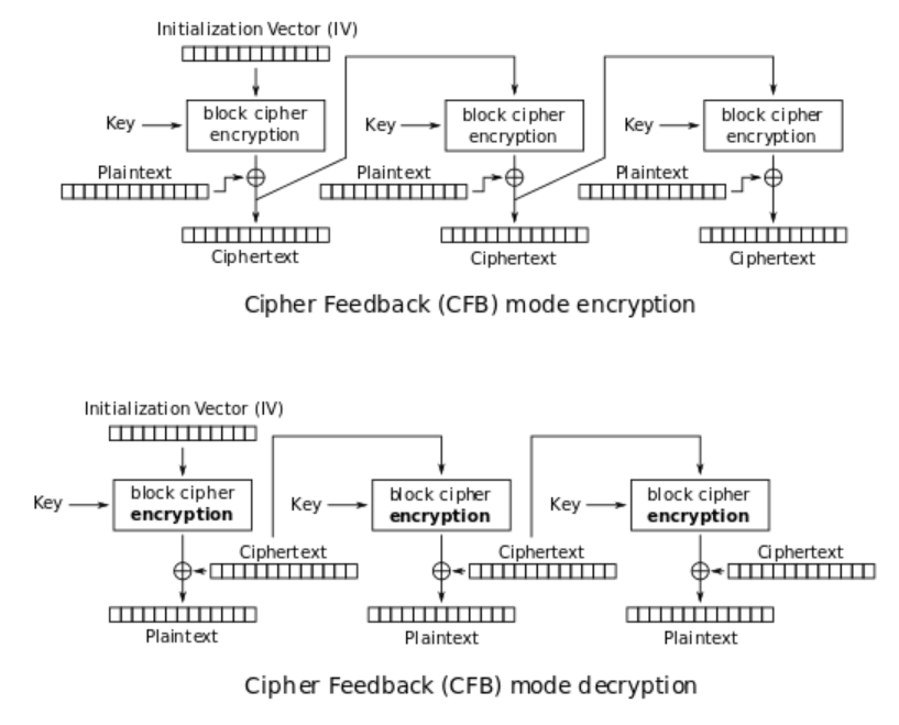 CBC Mode를 변형한 모드로 블록 암호를 자기 동기 스트림 암호로 변환하는 모드이다. 평문과 암호문의 길이가 같아서 padding이 필요하지 않으며 암호화는 순차적으로 진행하지만 복호화는 병렬처리가 가능하다.