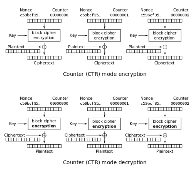 CTR(Counter) 방식은 블록 암호를 스트림 암호로 바꾸는 방식인데 각 블록마다 몇번째 블록인지 의미하는 값을 부여하고 그 숫자와 nonce(임의의 값)를 결합하여 블록 암호할 때 입력한다. CTR모드의 경우 이전 블록에 의존하지 않기 때문에 암복호화 모두 병렬처리가 가능하다.