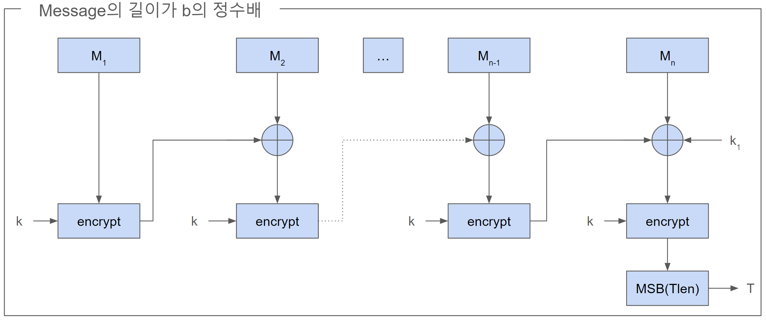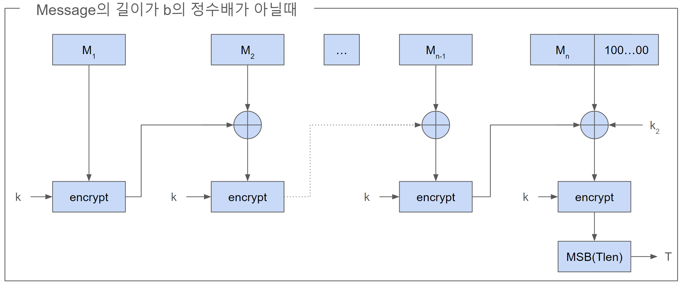 6. n-1번째 블록을 암호화 한 값, n번째 Message, k1 or k2와 XOR연산 후 k로 암호화한다.