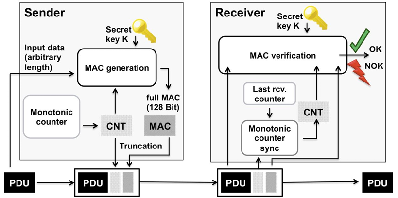 위 그림을 보면 알 수 있는데 PDU만 전송을 하게 되면 통신의 무결성을 해칠 수 있기 때문에 CNT(몇 번째 데이터 패킷인지 확인할 수 있는 데이터)와 함께 MAC값을 추가해서 전달하게 된다.