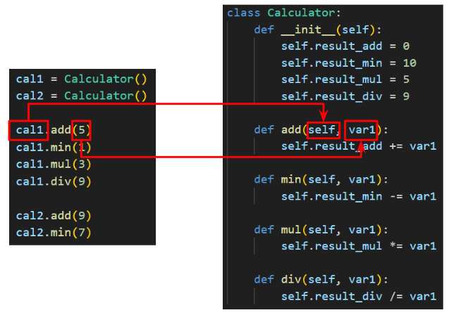 Calculator의 add 매서드의 첫 번째 인자 self에는 객체 cal1이 자동으로 전달되고 나머지 인자는 순차적으로 전달된다.